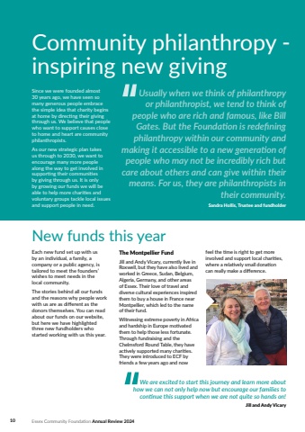 10 Essex Community Foundation Annual Review 2024Each new fund set up with us by an individual, a family, a company or a public agency, is tailored to meet the founders%u2019 wishes to meet needs in the local community. The stories behind all our funds and the reasons why people work with us are as different as the donors themselves. You can read about our funds on our website, but here we have highlighted three new fundholders who started working with us this year. New funds this yearSince we were founded almost 30 years ago, we have seen so many generous people embrace the simple idea that charity begins at home by directing their giving through us. We believe that people who want to support causes close to home and heart are community philanthropists. As our new strategic plan takes us through to 2030, we want to encourage many more people along the way to get involved in supporting their communities by giving through us. It is only by growing our funds we will be able to help more charities and voluntary groups tackle local issues and support people in need.Community philanthropy - inspiring new givingUsually when we think of philanthropy or philanthropist, we tend to think of people who are rich and famous, like Bill Gates. But the Foundation is redefining philanthropy within our community and making it accessible to a new generation of people who may not be incredibly rich but care about others and can give within their means. For us, they are philanthropists in their community.Sandra Hollis, Trustee and fundholder%u2018%u2018The Montpellier FundJill and Andy Vicary, currently live in Roxwell, but they have also lived and worked in Greece, Sudan, Belgium, Algeria, Germany, and other areas of Essex. Their love of travel and diverse cultural experiences inspired them to buy a house in France near Montpellier, which led to the name of their fund. Witnessing extreme poverty in Africa and hardship in Europe motivated them to help those less fortunate. Through fundraising and the Chelmsford Round Table, they have actively supported many charities. They were introduced to ECF by friends a few years ago and now feel the time is right to get more involved and support local charities, where a relatively small donation can really make a difference. %u2018%u2018We are excited to start this journey and learn more about how we can not only help now but encourage our families to continue this support when we are not quite so hands on!Jill and Andy Vicary