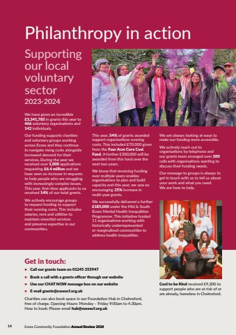 14 Essex Community Foundation Annual Review 2024Philanthropy in actionSupporting our local voluntary sector 2023-2024We have given an incredible %u00a33,341,785 in grants this year to 466 voluntary organisations and 142 individuals. Our funding supports charities and voluntary groups working across Essex and they continue to navigate rising costs alongside increased demand for their services. During the year we received over 1,000 applications requesting %u00a36.4 million and we have seen an increase in requests to help people who are struggling with increasingly complex issues. This year, first-time applicants to us received 14% of our total grants.We actively encourage groups to request funding to support their running costs. This includes salaries, rent and utilities to maintain essential services and preserve expertise in our communities. This year, 54% of grants awarded support organisations running costs. This included %u00a370,000 given from the Four Acre Core Cost Fund. A further %u00a3300,000 will be awarded from this fund over the next two years.We know that receiving funding over multiple years enables organisations to plan and build capacity and this year, we saw an encouraging 25% increase in multi-year grants.We successfully delivered a further %u00a3185,000 under the Mid & South Essex Mental Health Inequalities Programme. This initiative funded 11 organisations working with historically underrepresented or marginalised communities to address health inequalities.We are always looking at ways to make our funding more accessible. We actively reach out to organisations by telephone and our grants team arranged over 200calls with organisations wanting to discuss their funding needs. Our message to groups is always to get in touch with us to tell us about your work and what you need. We are here to help.Get in touch: %u2022 Call our grants team on 01245 355947%u2022 Book a call with a grants officer through our website%u2022 Use our CHAT NOW message box on our website%u2022 E-mail grants@essexcf.org.ukCharities can also book space in our Foundation Hub in Chelmsford, free of charge. Opening Hours: Monday %u2013 Friday 9:00am to 4.30pm.How to book: Please email hub@essexcf.org.ukHarlow Hindu SocietyCool to be Kind received %u00a39,200 to support people who are at risk of or are already, homeless in Chelmsford.