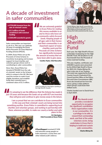 15Safer communities are important to all of us. This year, we celebrate 10 years of managing the Essex Police Proceeds of Crime Matched Funding Scheme (POCA).In 2004, Essex Police set up the Proceeds of Crime Scheme to incentivise local giving and increase support for local charities and voluntary groups whose work is contributing to safer communities.Since then, Essex Police has donated %u00a3750,000 from the sale of criminals%u2019 assets to the Scheme which is unique in the UK. We have used the monies to match fund eligible donations and establish funds that currently have a combined value of %u00a31.5 million. %u2022 %u00a3750,000 donated from the sale of criminals%u2019 assets %u2022 %u00a31.5 million of funds established with matched funding%u2022 %u00a3360,000 awarded in grantsA decade of investment in safer communitiesIt is amazing to see the difference that the Scheme has made in just 10 years and because the funds set up with ECF are invested, they will grow and continue to give money away in the future.I am so proud that we can contribute to Essex communities in this way and that criminals%u2019 assets are being turned into something positive. Essex Police is committed to supporting local charities and voluntary groups, and working in partnership with them, wherever possible, to make our county a better and safer place to live.B-J Harrington, Chief Constable at Essex PoliceWe are extremely grateful to Essex Police for making this money available to us and to those who have set up community safety focused funds. Keeping people of all ages safe in their homes and their communities is an important aspect of many charities work and the Proceeds of Crime Scheme has significantly increased the amount of money that we have been able to give away.Caroline Taylor, Chief ExecutiveHigh Sheriffs%u2019 FundEach year, the High Sheriff of Essex undertakes fundraising for the High Sheriffs%u2019 Fund. All donations to the Fund benefit from the Proceeds of Crime matched funding. This year, trophies, certificates and %u00a338,000 in grants were presented by the 843rd High Sheriff of Essex for 2023-24, Charles Bishop DL, who is also one of our Trustees. The event was supported by Essex County Council, Chelmsford City Council and the Office of the Police, Fire and Crime Commissioner. BBC Essex also broadcast live from the venue, giving a wider platform where groups could share their brilliant work.Charles handed over to David Hurst in April 2024. The Awards event provides a wonderful opportunity to recognise the significant contribution these organisations make in our communities. It is a privilege to be able to reward their outstanding work, and that of the wider voluntary sector, being undertaken in Essex that is helping to build and sustain safer communities.Charles Bishop DLCharles Bishop, High Sheriff, presenting the High Sheriffs%u2019 Shield to YMCA Essex for their work helping young people aged 16-25, to develop their skills, potential and life chances.%u2018%u2018%u2018%u2018%u2018%u2018Chief Constable B-J Harrington speaking at the High Sheriffs%u2019 Awards.UTurn4Support received %u00a37,458 and educates young people on knife awareness, county lines and other related youth violence.