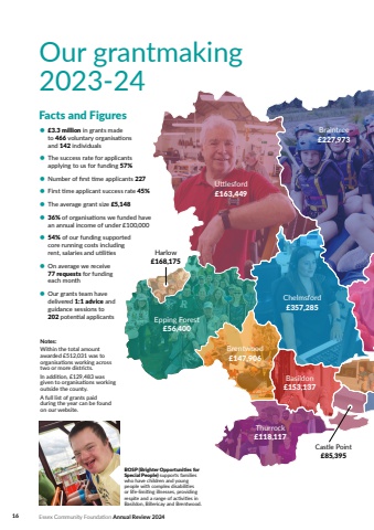 16 Essex Community Foundation Annual Review 2024Our grantmaking 2023-24Facts and Figures%u2022 %u00a33.3 million in grants made to 466 voluntary organisations and 142 individuals%u2022 The success rate for applicants applying to us for funding 57%%u2022 Number of first time applicants 227%u2022 First time applicant success rate 45%%u2022 The average grant size %u00a35,148%u2022 36% of organisations we funded have an annual income of under %u00a3100,000%u2022 54% of our funding supported core running costs including rent, salaries and utilities%u2022 On average we receive 77 requests for funding each month%u2022 Our grants team have delivered 1:1 advice and guidance sessions to202 potential applicantsNotes: Within the total amount awarded %u00a3512,031 was to organisations working across two or more districts. In addition, %u00a3129,483 was given to organisations working outside the county. A full list of grants paid during the year can be found on our website.Castle Point%u00a385,395Braintree%u00a3227,973Uttlesford%u00a3163,449Harlow%u00a3168,175Epping Forest%u00a356,400Brentwood%u00a3147,906Thurrock%u00a3118,117Basildon%u00a3153,137Chelmsford %u00a3357,285BOSP (Brighter Opportunities for Special People) supports families who have children and young people with complex disabilities or life-limiting illnesses, providing respite and a range of activities in Basildon, Billericay and Brentwood.
