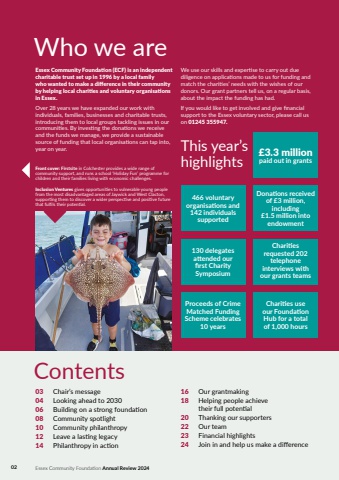 Essex Community Foundation (ECF) is an independent charitable trust set up in 1996 by a local family who wanted to make a difference in their community by helping local charities and voluntary organisations in Essex.Over 28 years we have expanded our work with individuals, families, businesses and charitable trusts, introducing them to local groups tackling issues in our communities. By investing the donations we receive and the funds we manage, we provide a sustainable source of funding that local organisations can tap into, year on year. We use our skills and expertise to carry out due diligence on applications made to us for funding and match the charities%u2019 needs with the wishes of our donors. Our grant partners tell us, on a regular basis, about the impact the funding has had.If you would like to get involved and give financial support to the Essex voluntary sector, please call us on 01245 355947.03 Chair%u2019s message04 Looking ahead to 203006 Building on a strong foundation08 Community spotlight10 Community philanthropy12 Leave a lasting legacy14 Philanthropy in action16 Our grantmaking18 Helping people achieve their full potential20 Thanking our supporters22 Our team23 Financial highlights24 Join in and help us make a difference Contents02 Essex Community Foundation Annual Review 2024This year%u2019s highlights%u00a33.3 million paid out in grants Donations received of %u00a33 million, including %u00a31.5 million into endowment466 voluntary organisations and 142 individuals supportedCharities requested 202 telephone interviews with our grants teams130 delegates attended our first Charity SymposiumCharities use our Foundation Hub for a total of 1,000 hoursProceeds of Crime Matched Funding Scheme celebrates 10 yearsFront cover: Firstsite in Colchester provides a wide range of community support, and runs a school %u2018Holiday Fun%u2019 programme for children and their families living with economic challenges. Inclusion Ventures gives opportunities to vulnerable young people from the most disadvantaged areas of Jaywick and West Clacton, supporting them to discover a wider perspective and positive future that fulfils their potential.Who we are