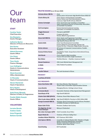 22 Essex Community Foundation Annual Review 2024STAFFCaroline TaylorChief ExecutiveZoe BramptonGrants ManagerCatherine BurtonDirector of Finance & Resources Dee DaviesExecutive AssistantAdeola DosunmuGrants OfficerLisa GreenGrants OfficerTracy HardyFinance ManagerLucy HollingtonGrants & Communications AdministratorMaria KravchukOffice Administrator Jo MacaulayHead of Communications Steven MackenzieHead of OperationsPerry NortonHead of Development Andy Payne WorpoleDirector of Policy & ProgrammesFrankie Webb-HuseyinGrants OfficerVOLUNTEERSLorraine Brooks Andrew ClarkeAnne FitzgeraldBarbara GarsideTRUSTEE BOARD (as at 30 June 2024)Nicholas Alston CBE DL ChairFormer senior civil servant; High Sheriff of Essex 2022/23Charles Bishop DL Chair, Finance and Investment Committee Former Partner and Chief Administrative Officer, Cazenove; High Sheriff of Essex 2023/24Gemma Cartwright Chair, Governance and Compliance Committee;Head of Investment Practice & Partnership, Association of Charitable FoundationsGail Cunningham Former Head of Investment Learning, Association of Charitable FoundationsMaggie Desmond Principal at ghSMARTTim Field Company SecretaryPartner, Birkett Long SolicitorsSimon Hall MBE DL Chair, Grants and Programmes CommitteeFormer Partner, Freshfields Bruckhaus Deringer LLP; High Sheriff of Essex 2017/18Sandra Hollis Chair, Fund Development CommitteeFormer Global Accounts Manager, Reuters Ltd;Former Pro Vice- Chancellor, Anglia Ruskin UniversityDorine Johnson VP & Head of Corporate Communications, Franklin TempletonSoumya Krishna Kumar Quantitative Trader, Susquehanna International Group, LLP (SIG)Atul Manek Chair of Audit & Risk CommitteeFormer CFO and COO, Insight InvestmentBen Minter Portfolio Director %u2013 Charities, Cazenove CapitalStewart Sanderson CEO, Irwin Mitchell Asset Management LtdJo Wells CEO, Firebird FoundationPATRONJennifer Tolhurst The Lord-Lieutenant of EssexPRESIDENTLord Petre JP KCVOVICE PRESIDENTSDame Kate Barker CBE Non-Exec Director, Man Group plc;Trustee Chair, Universities Superannuation SchemeJason Bartella Managing Director, Heritage Leisure GroupDr Jerome Booth Economist; Chairman of New Sparta Asset ManagementDavid Boyle JP DL High Sheriff 2002/03Charles Clark OBE QPM DL Chairman, Essex Police Museum Trust; Giles Coode-Adams OBE DL High Sheriff 2000/01; President of RHS 2006-2008George Courtauld OBE DL President, Rural Community Council of Essex; President of EWAG; President of SSAFA (Essex)Robert Erith TD DL President, Dedham Vale SocietyThe Right Rev Dr Guli Francis-DehqaniBishop of Chelmsford Ben-Julian Harrington QPM Chief Constable, Essex PoliceRupert Marks DL Chairman of Pioneer Sailing TrustJonathan Minter FRCGP DL ECF Chairman 2013-2018John Spence CBE DL Councillor & Cabinet Member ECC; Member of Anglia Ruskin University Philanthropic Foundation; Member Chelmsford Cathedral Council; Chairman Spicer Haart GroupDavid Starling ECF FundholderOur team
