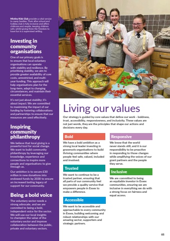 05Investing in community organisationsOne of our primary goals is to ensure that local voluntary organisations can operate with stability and resilience. By prioritising stability, we aim to provide greater availability of core costs, unrestricted, and multiyear funding. This approach will help organisations plan for the long-term, adapt to changing circumstances, and maintain their essential services.It%u2019s not just about stability; it%u2019s about impact. We are committed to maximising the impact of our funding by fostering collaborations and partnerships to ensure that our resources are used effectively.Inspiring community philanthropyWe believe that local giving is a powerful tool for social change. We want to build community philanthropy by leveraging our knowledge, experience and connections to inspire more people and organisations to give through us. Our ambition is to secure %u00a330 million in new donations into endowed funds by 2030 to ensure an increased lasting legacy of support for our community.Being a bold voiceThe voluntary sector needs a strong advocate, and we are commited to being a bold, independent voice for the sector. We will use our local insights to champion the value of the voluntary sector and improve collaboration between the public, private and voluntary sectors.Mistley Kids Club provides a vital service to many families. Their after school and holiday club is fully inclusive and offers childcare and respite, keeping children safe, whilst giving them the freedom to have fun in a supervised setting.Living our values Our strategy is guided by core values that define our work - boldness, trust, accessibility, responsiveness, and inclusivity. These values are not just words, they are the principles that shape our actions and decisions every day.BoldWe have a bold ambition as a strong local leader investing in grassroots organisations to build thriving communities where people feel safe, valued, included and involved.TrustedWe want to continue to be a trusted partner, ensuring that all parts of our community feel we provide a quality service that empowers people in Essex to make a difference.AccessibleWe want to be accessible and approachable to every community in Essex, building welcoming and robust relationships with our amazing sector, supporters and strategic partners. ResponsiveWe know that the world never stands still, and it is our responsibility to be proactive in responding to those changes while amplifying the voices of our grant partners and the people they serve. InclusiveWe are committed to being an equitable investor in Essex communities, ensuring we are inclusive in everything we do with a strong focus on fairness and equal access.