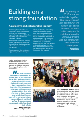 06 Essex Community Foundation Annual Review 2024Building on a strong foundationPauline Dodd (front), Chair of the Chelmsford Star Co-opMembership Committee, visited Braintree Re-think Art and Social Group supporting those with mental illness. We make a point of visiting every organisation we support. I get so much joy from these visits, understanding the passions behind the people dedicated to each cause and hearing stories from those benefiting. Most groups want to increase public awareness about what they do or who they help, so they%u2019re always keen to talk about how our grant will be put to use. In turn, we report back to our Board and our Co-op members so more people get to hear about their efforts. Pauline Dodd, Chair, CSC Membership CommitteeThe Collier Family Fund was set up by Jane Collier (far left). She visited the day centre run by Bright Lives in Colchester to learn about their work supporting people with autism and other complex mental health issues. Regular activity sessions including cookery and movement to music helps to support the health and wellbeing of members.Over nearly three decades, we have been a strong supporter for local charities and voluntary organisations, giving over %u00a350 million to support local charities and individuals in Essex. Working with our donors, listening to their interests and connecting them with local charities continues to be an important part of our new strategy. We already know that our donors enjoy seeing firsthand the impact of their grantmaking and visiting funded organisations. As part of our next community listening project, we have been working with an independent researcher to produce a survey that was shared with all our donors. The results will help us to have a greater understanding of how they became involved with us, how they feel about their grantmaking and how they want to engage with us and the charities they support.The journey to 2030 is one we undertake together. Our strategy is not just about what we will do, but about how we can work collectively and in collaboration with donors, partners and our community to achieve our shared goals. Caroline Taylor, Chief Executive A collective and collaborative journey%u2018%u2018%u2018%u2018
