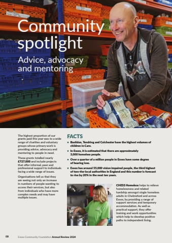 08 Essex Community Foundation Annual Review 2024The highest proportion of our grants paid this year was to a wide range of charities and voluntary groups whose primary work is providing advice, advocacy and mentoring to people in need. These grants totalled nearly %u00a3727,000 and include projects that offer informal, peer and professional support to individuals facing a wide range of issues.Organisations tell us that they are seeing not only an increase in numbers of people wanting to access their services, but also from individuals who have more complex needs and may have multiple issues. FACTS%u2022 Basildon, Tendring and Colchester have the highest volumes of children in Care.%u2022 In Essex, it is estimated that there are approximately 3,000 homeless people.%u2022 Over a quarter of a million people in Essex have some degree of hearing loss.%u2022 Essex has around 55,000 vision impaired people, the third highest of two-tier local authorities in England and this number is forecast to rise by 20% in the next ten years.CHESS Homeless helps to relieve homelessness and related hardship amongst single homeless adults in Chelmsford and across Essex, by providing a range of support services and temporary accommodation. As well as practical support, they offer training and work opportunities which help to develop positive paths to independent living. Advice, advocacy and mentoringCommunity spotlight