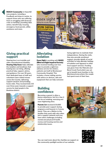 You can read more about the charities we support on the community spotlight section of our website.09REACH Community in Haverhill runs projects, including a Foodbank and drop-in centre, to support those who are suffering from or struggling with financial crisis or hardship, providing debt advice, benefit help, housing, emergency food parcels, utility assistance and more.Alleviating isolationEssex Sight is working with BASIS (Blind and Sight Impaired Society)who received funding over two years to provide a sight loss advisory service for visitors, patients and staff at Brentwood Community Hospital. This includes a home visiting service with advice on devices, aids and equipment that can help someone facing sight loss to maintain their independence. During the visits, they also provide emotional support, provide details of social activities to help alleviate feelings of isolation and signpost to other local support services. Funding was given from the Malcolm and Beryl Crook Fund which was set up to benefit local charities in the Brentwood area where the couple had spent most of their lives.Building confidence Becoming a parent is often a joyous experience, but for a few it can be an isolating, worrying and even frightening time.Parents 1st received %u00a310,000 to provide peer-support during pregnancy and beyond, in Canvey Island. They are a lifeline to the families they work with who often lack a support network and may have other challenges including mental and physical ill health, money and housing worries and relationship issues.Giving practical supportHearing loss is an invisible and often misunderstood disability. Hearing Help Essex helps alleviate the isolation and loneliness that hearing loss can bring, offering practical help, support, advice, and guidance. For over 30 years, their dedicated team of staff and volunteers have visited venues across the County, delivering support sessions and providing home visits. They received %u00a322,110 over three years towards a support service for deaf people in the Braintree district.