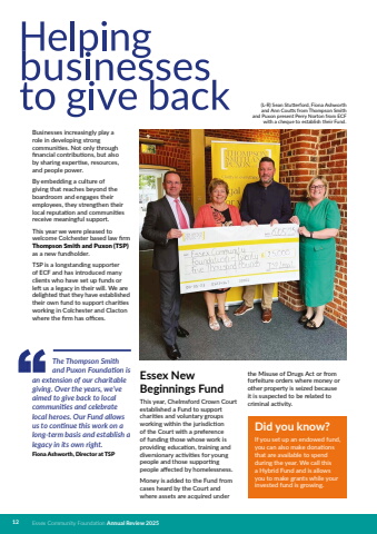 12 Essex Community Foundation Annual Review 2025Essex New Beginnings Fund This year, Chelmsford Crown Court established a Fund to support charities and voluntary groups working within the jurisdiction of the Court with a preference of funding those whose work is providing education, training and diversionary activities for young people and those supporting people affected by homelessness.Money is added to the Fund from cases heard by the Court and where assets are acquired under the Misuse of Drugs Act or from forfeiture orders where money or other property is seized because it is suspected to be related to criminal activity.Did you know? If you set up an endowed fund, you can also make donations that are available to spend during the year. We call this a Hybrid Fund and is allows you to make grants while your invested fund is growing. (L-R) Sean Stutterford, Fiona Ashworth and Ann Coutts from Thompson Smith and Puxon present Perry Norton from ECF with a cheque to establish their Fund.The Thompson Smith and Puxon Foundation is an extension of our charitable giving. Over the years, we%u2019ve aimed to give back to local communities and celebrate local heroes. Our Fund allows us to continue this work on a long-term basis and establish a legacy in its own right.Fiona Ashworth, Director at TSPBusinesses increasingly play a role in developing strong communities. Not only through financial contributions, but also by sharing expertise, resources, and people power. By embedding a culture of giving that reaches beyond the boardroom and engages their employees, they strengthen their local reputation and communities receive meaningful support. This year we were pleased to welcome Colchester based law firm Thompson Smith and Puxon (TSP)as a new fundholder. TSP is a longstanding supporter of ECF and has introduced many clients who have set up funds or left us a legacy in their will. We are delighted that they have established their own fund to support charities working in Colchester and Clacton where the firm has offices.