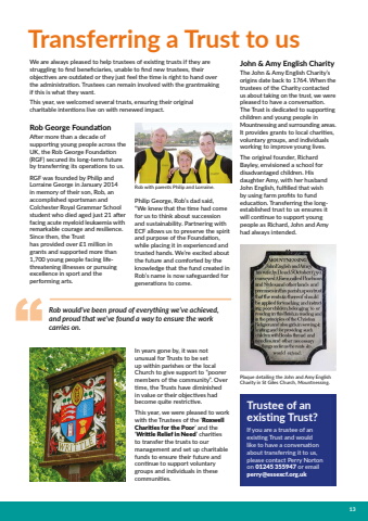 13In years gone by, it was not unusual for Trusts to be set up within parishes or the local Church to give support to %u201cpoorer members of the community%u201d. Over time, the Trusts have diminished in value or their objectives had become quite restrictive.This year, we were pleased to work with the Trustees of the %u2018Roxwell Charities for the Poor%u2019 and the %u2018Writtle Relief in Need%u2019 charities to transfer the trusts to our management and set up charitable funds to ensure their future and continue to support voluntary groups and individuals in these communities. Trustee of an existing Trust?If you are a trustee of an existing Trust and would like to have a conversation about transferring it to us, please contact Perry Norton on 01245 355947 or email perry@essexcf.org.ukRob George FoundationAfter more than a decade of supporting young people across the UK, the Rob George Foundation (RGF) secured its long-term future by transferring its operations to us. RGF was founded by Philip and Lorraine George in January 2014 in memory of their son, Rob, an accomplished sportsman and Colchester Royal Grammar School student who died aged just 21 after facing acute myeloid leukaemia with remarkable courage and resilience. Since then, the Trust has provided over %u00a31 million in grants and supported more than 1,700 young people facing lifethreatening illnesses or pursuing excellence in sport and the performing arts. Philip George, Rob%u2019s dad said, %u201cWe knew that the time had come for us to think about succession and sustainability. Partnering with ECF allows us to preserve the spirit and purpose of the Foundation, while placing it in experienced and trusted hands. We%u2019re excited about the future and comforted by the knowledge that the fund created in Rob%u2019s name is now safeguarded for generations to come.John & Amy English CharityThe John & Amy English Charity%u2019s origins date back to 1764. When the trustees of the Charity contacted us about taking on the trust, we were pleased to have a conversation. The Trust is dedicated to supporting children and young people in Mountnessing and surrounding areas. It provides grants to local charities, voluntary groups, and individuals working to improve young lives. The original founder, Richard Bayley, envisioned a school for disadvantaged children. His daughter Amy, with her husband John English, fulfilled that wish by using farm profits to fund education. Transferring the longestablished trust to us ensures it will continue to support young people as Richard, John and Amy had always intended. Rob would%u2019ve been proud of everything we%u2019ve achieved, and proud that we%u2019ve found a way to ensure the work carries on.We are always pleased to help trustees of existing trusts if they are struggling to find beneficiaries, unable to find new trustees, their objectives are outdated or they just feel the time is right to hand over the administration. Trustees can remain involved with the grantmaking if this is what they want. This year, we welcomed several trusts, ensuring their original charitable intentions live on with renewed impact.Rob with parents Philip and Lorraine.Transferring a Trust to usPlaque detailing the John and Amy English Charity in St Giles Church, Mountnessing.