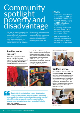 16 Essex Community Foundation Annual Review 2025Families under pressureWithout an appropriate school uniform, children can often experience feelings of isolation and bullying. Dynamic New Anglian Networks based in Colchester run projects aimed at helping anyone who is in need through hardship or circumstance. We supported their Free School Uniform project which provides low-income families in Colchester with recycled school uniforms and sportswear, ensuring that children can be confident when they attend school. Welfare adviceSince 1985, the dedicated staff and volunteers at DIAL South Essexhave been providing support, advice, guidance and advocacy to people with disabilities, helping them on a range of topics including benefits, signposting, referrals, leisure and access. We supported the core costs of this vital organisation with a grant of %u00a310,000. Community spotlight %u2013 poverty and disadvantageDeprivation is not just about money, it%u2019s also about isolation, poor housing, limited transport, and a lack of community infrastructure. Local charities combine practical help with emotional support, ensuring people feel less isolated, know where to turn and are treated with dignity.Andy Payne-Worpole, Director of Policy and ProgrammesThis year, we saw an increase in the number of grants paid to charities helping people who are struggling to manage in everyday life.These grants totalled %u00a3666,452 and include projects that offer a support to those who are in difficult circumstances, including families who are juggling rent arrears and food insecurity, older people who have fallen into debt and temporary accommodation and advocacy for those who are homeless.FACTS%u2022 Deprivation is most acute in coastal towns: 31% of residents in Clacton and Harwich (44,000 people) and 23% in Southend(40,800 people).%u2022 In Tendring, Harlow and Basildon, nearly 1 in 3 children are eligible for Free School Meals%u2022 55% of households in Tendring District have a discretionary income of less than %u00a3125 per month.Dial South Essex.The team at DIAL South Essex.DNA Networks Free School Uniform project in Colchester.