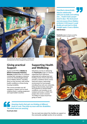 17Giving practical SupportA grant of %u00a34,950 to Maldon & District Community Voluntary Services enabled them to continue running their emergency response service for disadvantaged people across Maldon district, including those on low incomes, with mental health conditions or those facing housing instability.This service provides one-off emergency support such as food, childcare items, cooking equipment and supermarket vouchers. You can read more about the charities we support on the community spotlight section of our website.Supporting Health and WellbeingVolunteers are key to delivering the Food Cycle project in Clacton organising food collections, preparing and cooking food and hosting a lunch. Every week they provide a nutritious three-course meal and create a welcoming environment for local people, including those who are vulnerable, living on low incomes, have longterm physical or mental health conditions, are homeless or are isolated and lonely. In 2024, the project also saved a massive 14,145kg of surplus food from going to waste.I had fled a domestically abusive relationship with just my baby and nothing else%u2026 I hadn%u2019t had a proper meal in days. The food parcel and microwave [from Maldon & District CVS] meant I could finally eat and start to think straight again. It was a lifeline. MDCVS ClientAmazing charity that gets me thinking of different foods to cook. They help my mum with her disabilities. The whole team are amazing.Food Cycle clientFood Cycle project in Clacton providing nutritious meals for people in need.Anna Appleyard, Operations Manager at Maldon CVS checking stock for their emergency response service.