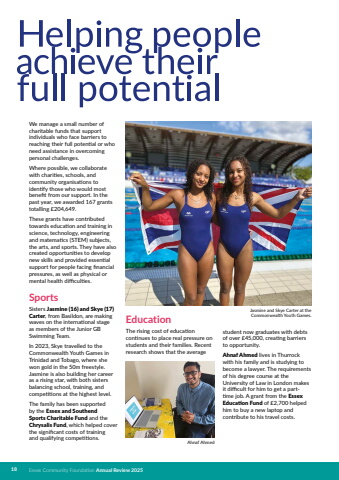 18 Essex Community Foundation Annual Review 2025We manage a small number of charitable funds that support individuals who face barriers to reaching their full potential or who need assistance in overcoming personal challenges.Where possible, we collaborate with charities, schools, and community organisations to identify those who would most benefit from our support. In the past year, we awarded 167 grants totalling %u00a3204,649.These grants have contributed towards education and training in science, technology, engineering and matematics (STEM) subjects, the arts, and sports. They have also created opportunities to develop new skills and provided essential support for people facing financial pressures, as well as physical or mental health difficulties.SportsSisters Jasmine (16) and Skye (17) Carter, from Basildon, are making waves on the international stage as members of the Junior GB Swimming Team.In 2023, Skye travelled to the Commonwealth Youth Games in Trinidad and Tobago, where she won gold in the 50m freestyle. Jasmine is also building her career as a rising star, with both sisters balancing school, training, and competitions at the highest level.The family has been supported by the Essex and Southend Sports Charitable Fund and the Chrysalis Fund, which helped cover the significant costs of training and qualifying competitions. EducationThe rising cost of education continues to place real pressure on students and their families. Recent research shows that the average student now graduates with debts of over %u00a345,000, creating barriers to opportunity. Ahnaf Ahmed lives in Thurrock with his family and is studying to become a lawyer. The requirements of his degree course at the University of Law in London makes it difficult for him to get a parttime job. A grant from the Essex Education Fund of %u00a32,700 helped him to buy a new laptop and contribute to his travel costs. Jasmine and Skye Carter at the Commonwealth Youth Games.Ahnaf Ahmed
