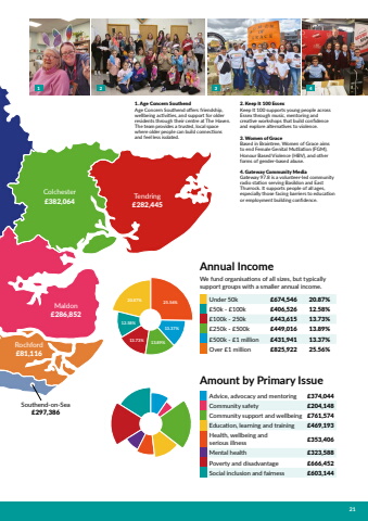 212. Keep It 100 EssexKeep It 100 supports young people across Essex through music, mentoring and creative workshops that build confidence and explore alternatives to violence.1. Age Concern SouthendAge Concern Southend offers friendship, wellbeing activities, and support for older residents through their centre at The Haven. The team provides a trusted, local space where older people can build connections and feel less isolated. 3. Women of GraceBased in Braintree, Women of Grace aims to end Female Genital Mutilation (FGM), Honour Based Violence (HBV), and other forms of gender-based abuse.4. Gateway Community MediaGateway 97.8 is a volunteer-led community radio station serving Basildon and East Thurrock. It supports people of all ages, especially those facing barriers to education or employment building confidence.25.56%13.37%13.89% 13.73%20.87%12.58%Annual Income We fund organisations of all sizes, but typically support groups with a smaller annual income. Amount by Primary Issue Under 50k %u00a3674,546 20.87%%u00a350k - %u00a3100k %u00a3406,526 12.58%%u00a3100k - 250k %u00a3443,615 13.73%%u00a3250k - %u00a3500k %u00a3449,016 13.89%%u00a3500k - %u00a31 million %u00a3431,941 13.37%Over %u00a31 million %u00a3825,922 25.56%Advice, advocacy and mentoring %u00a3374,044Community safety %u00a3204,148Community support and wellbeing %u00a3761,574Education, learning and training %u00a3469,193Health, wellbeing and serious illness %u00a3353,406Mental health %u00a3323,588Poverty and disadvantage %u00a3666,452Social inclusion and fairness %u00a3603,1441 2 3 4Colchester%u00a3382,064 Tendring%u00a3282,445Maldon %u00a3286,852Rochford%u00a381,116Southend-on-Sea%u00a3297,386