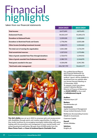 22 Essex Community Foundation Annual Review 20252024/2025 2023/2024Total income: 8,477,899 4,875,495Endowment Funds: 54,515,147 51,045,173Donations to Endowed Funds: 5,339,028 1,485,844Donations to Restricted Funds and Grants: 1,778,396 2,035,188Other Income (including investment income): 1,360,475 1,354,463The total cost of running the organisation: 1,061,308 1,176,194Total unrestricted reserves: 1,327,010 1,373,486Value of grants awarded from Flow-through donations: 1,723,973 1,194,915Value of grants awarded from Endowment donations: 2,380,725 2,146,870Total grants awarded in the year: 4,104,698 3,341,785 Total funds under management %u00a356,787,799 53,624,177Our audited Annual Report and Financial Statements for 2024/2025 incorporating the auditors%u2019 report, will be available to download from our website after our Annual General Meeting on 13 November 2025. To request a hard copy please contact Catherine Burton, Director of Finance & Resources, on 01245 355947 or by e-mail to hello@essexcf.org.uk.AuditorsHaysmacintyre LLPBankersHandelsbanken plcInvestmentsJupiter Investment Management Group Limited (formerly CCLA)Rathbones (Incorporating Investec Wealth & Investment;Cazenove CapitalPayrollStreets WhittlesSolicitorsKnights plcThis Girl%u2019s Ability was set up in 2022 to empower girls and young women with disabilities through sports and creative opportunities. In doing so, they tackle loneliness by encouraging meaningful relationships with peers, helping with the prevention and management of poor mental health, and enhancing physical well-being. We gave them %u00a34,000 jointly from the Diana Tinson Fund and Essex & Southend Sports Charitable Trust. taken from our financial statements