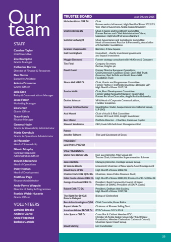 23Our teamSTAFFCaroline TaylorChief ExecutiveZoe BramptonGrants ManagerCatherine BurtonDirector of Finance & Resources Dee DaviesExecutive AssistantAdeola DosunmuGrants OfficerJulia EssePolicy & Communications ManagerJesse FarrerMarketing Manager Lisa GreenGrants OfficerTracy HardyFinance ManagerGemma HealyGrants & Stewardship AdministratorMaria KravchukGrants & Operations AdministratorJo MacaulayHead of Stewardship Niamh MurphyFund Development Administration OfficerSteven MackenzieHead of OperationsPerry NortonHead of Development Matthew PageFinance AdministratorAndy Payne WorpoleDirector of Policy & ProgrammesFrankie Webb-HuseyinGrants OfficerVOLUNTEERSLorraine BrooksAndrew ClarkeAnne FitzgeraldBarbara GarsideTRUSTEE BOARD as at 30 June 2025Nicholas Alston CBE DL ChairFormer senior civil servant; High Sheriff of Essex 2022/23Vice-chair of Governors, Anglia Ruskin UniversityCharles Bishop DL Chair, Finance and Investment CommitteeFormer Partner and Chief Administrative Officer, Cazenove; High Sheriff of Essex 2023/24Gemma Cartwright Chair, Governance and Compliance Committee;Head of Investment Practice & Partnership, Association of Charitable FoundationsGraham Chapman KC Barrister, 4 New SquareGail Cunningham Consultant - charity investment governance and impact investmentMaggie Desmond Former strategy consultant with McKinsey & CompanyTim Field Company SecretaryPartner, Knights plcDavid Guest Former Director European Operations, Crisil Greenwich Coalition; Chair, Daws Hall Trust; Governor, East Suffolk and North Essex NHS Foundation TrustSimon Hall MBE DL Chair, Grants and Programmes CommitteeFormer Partner, Freshfields Bruckhaus Deringer LLP; High Sheriff of Essex 2017/18Sandra Hollis Chair, Fund Development CommitteeFormer Global Accounts Manager, Reuters Ltd;Former Pro Vice-Chancellor, Anglia Ruskin UniversityDorine Johnson VP & Head of Corporate Communications, Franklin TempletonSoumya Krishna Kumar Quantitative Trader, Susquehanna International Group, LLP (SIG)Atul Manek Chair of Audit & Risk CommitteeFormer CFO and COO, Insight InvestmentBen Minter Portfolio Director %u2013 Charities, Cazenove CapitalStewart Sanderson CEO, Irwin Mitchell Asset Management LtdPatronJennifer Tolhurst The Lord-Lieutenant of EssexPRESIDENTLord Petre JP KCVOVICE PRESIDENTSDame Kate Barker CBE Non-Exec Director, Man Group plc;Trustee Chair, Universities Superannuation SchemeJason Bartella Managing Director, Heritage Leisure GroupDr Jerome Booth Economist; Chairman of New Sparta Asset ManagementDavid Boyle JP DL High Sheriff of Essex 2002/03Charles Clark OBE QPM DL Chairman, Essex Police Museum Trust; Giles Coode-Adams OBE DL High Sheriff of Essex 2000/01; President of RHS 2006-08George Courtauld OBE DL President, Rural Community Council of Essex; President of EWAG; President of SSAFA (Essex)Robert Erith TD DL President, Dedham Vale Society, High Sheriff of Essex 1997/98The Right Rev Dr Guli Francis-DehqaniBishop of Chelmsford Ben-Julian Harrington QPM Chief Constable, Essex PoliceRupert Marks DL Chairman of Pioneer Sailing TrustJonathan Minter FRCGP DL ECF Chairman 2013-2018John Spence CBE DL Councillor & Cabinet Member ECC; Member of Anglia Ruskin University Philanthropic Foundation; Member Chelmsford Cathedral Council; Chairman Spicer Haart GroupDavid Starling ECF Fundholder