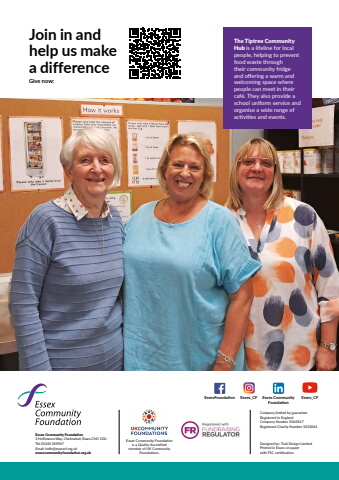 Essex Community Foundation is a Quality Accredited member of UK Community Foundations.Designed by: Trait Design LimitedPrinted in Essex on paper with FSC certificationEssex Community Foundation3 Hoffmanns Way, Chelmsford, Essex CM1 1GUTel: 01245 355947 Email: hello@essexcf.org.ukessexcommunityfoundation.org.ukCompany limited by guarantee Registered in EnglandCompany Number 3062567 Registered Charity Number 1052061EssexFoundation Essex Community FoundationEssex_CF Essex_CFThe Tiptree Community Hub is a lifeline for local people, helping to prevent food waste through their community fridge and offering a warm and welcoming space where people can meet in their caf%u00e9. They also provide a school uniform service and organise a wide range of activities and events.Join in and help us make a differenceGive no