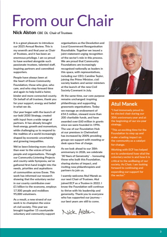 3Atul Manek%u201cI feel immensely proud to be elected chair during our 30th anniversary year and at the beginning of our six-year strategy.%u201cThis an exciting time for the Foundation to step up and make a lasting impact on the community as a catalyst for change. Working with ECF has helped me to understand how vital the voluntary sector is and how it is critical to the wellbeing of our society. As Chair, I am looking forward to continuing and expanding our support for the sector.%u201dFrom our ChairNick Alston cbe dl Chair of TrusteesIt is a great pleasure to introduce our 2025 Annual Review. This is my seventh and final year as Chair of Trustees, and it has been an enormous privilege. I am so proud to have worked alongside such passionate trustees, talented staff, inspiring partners and committed supporters. People have always been at the heart of Essex Community Foundation, those who give, who care, and who step forward time and again to help build a fairer, kinder and more connected county. On behalf of all trustees, thank you for your support, energy and belief in what we do.Our year began with the launch of our bold 2030 Strategy, created with input from a wide range of partners. It has already brought fresh energy, growth and momentum, while challenging us to respond to the realities of a world increasingly shaped by economic uncertainty and growing inequalities. We%u2019ve been listening more closely than ever to the voices of local people and organisations. Through our Community Listening Projects and county-wide Symposia, we%u2019ve gathered first-hand insight into the needs, priorities and aspirations of communities across Essex. This work has informed our research showing that the voluntary sector in our county contributes over %u00a31 billion to the economy, employs 17,500 people and mobilises 95,000 volunteers.As a result, a new strand of our work is to champion the voice of civil society. This year we brought together 15 countywide voluntary and community support organisations as the Devolution and Local Government Reorganisation Roundtable. Together we issued a joint statement urging recognition of the sector%u2019s role in this process. We are proud that Community Foundations are increasingly recognised nationally as leaders in this space, with representatives, including our CEO, Caroline Taylor, joining the Prime Minister, civil society leaders and senior ministers at the launch of the new Civil Society Covenant in July.At the same time, our core purpose remains unchanged: inspiring philanthropy and supporting grassroots organisations. Today we manage an endowment of %u00a354.5 million, steward more than 200 charitable funds, and have awarded over %u00a360 million in grants since we were founded in 1996. The use of our Foundation Hub at our premises in Chelmsford has increased by 200% providing groups we support with meeting or desk space free of charge.As we look ahead to our 30th anniversary in 2026, we celebrate %u201830 Years of Generosity%u2019 %u2013 honouring those who built this Foundation, sharing stories of impact, and inviting new philanthropists and partners to join us.I warmly welcome Atul Manek as our next Chair of Trustees. Atul joined ECF as a Trustee in 2022. I know the Foundation will continue to thrive with his leadership and generosity. Thank you to everyone who has supported our journey %u2013 our best years are still to come.