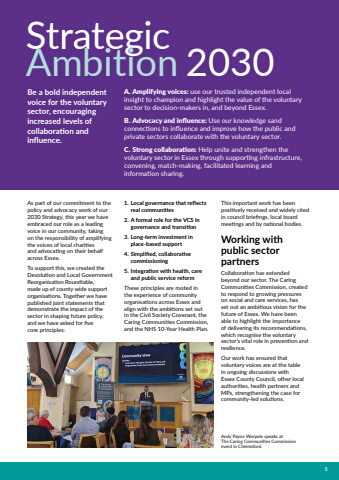 5Strategic Ambition 2030As part of our commitment to the policy and advocacy work of our 2030 Strategy, this year we have embraced our role as a leading voice in our community, taking on the responsibility of amplifying the voices of local charities and advocating on their behalf across Essex. To support this, we created the Devolution and Local Government Reorganisation Roundtable, made up of county wide support organisations. Together we have published joint statements that demonstrate the impact of the sector in shaping future policy, and we have asked for five core principles:1. Local governance that reflects real communities2. A formal role for the VCS in governance and transition3. Long-term investment in place-based support4. Simplified, collaborative commissioning5. Integration with health, care and public service reformThese principles are rooted in the experience of community organisations across Essex and align with the ambitions set out in the Civil Society Covenant, the Caring Communities Commission, and the NHS 10-Year Health Plan.This important work has been positively received and widely cited in council briefings, local board meetings and by national bodies.Working with public sector partnersCollaboration has extended beyond our sector. The Caring Communities Commission, created to respond to growing pressures on social and care services, has set out an ambitious vision for the future of Essex. We have been able to highlight the importance of delivering its recommendations, which recognise the voluntary sector%u2019s vital role in prevention and resilience.Our work has ensured that voluntary voices are at the table in ongoing discussions with Essex County Council, other local authorities, health partners and MPs, strengthening the case for community-led solutions.Andy Payne Worpole speaks at The Caring Communities Commission event in Chelmsford.A. Amplifying voices: use our trusted independent local insight to champion and highlight the value of the voluntary sector to decision-makers in, and beyond Essex.B. Advocacy and influence: Use our knowledge sand connections to influence and improve how the public and private sectors collaborate with the voluntary sector. C. Strong collaboration: Help unite and strengthen the voluntary sector in Essex through supporting infrastructure, convening, match-making, facilitated learning and information sharing. Be a bold independent voice for the voluntary sector, encouraging increased levels of collaboration and influence.