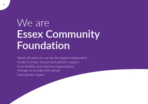 2We are Essex Community FoundationNearly 30 years on, we are the largest independent funder in Essex. Donors and partners support local charities and voluntary organisations through us to make their giving have greater impact.