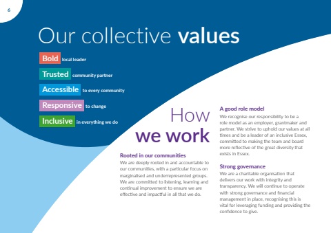 Our collective values6Rooted in our communities We are deeply rooted in and accountable to our communities, with a particular focus on marginalised and underrepresented groups. We are committed to listening, learning and continual improvement to ensure we are effective and impactful in all that we do.A good role modelWe recognise our responsibility to be a role model as an employer, grantmaker and partner. We strive to uphold our values at all times and be a leader of an inclusive Essex, committed to making the team and board more reflective of the great diversity that exists in Essex.Strong governanceWe are a charitable organisation that delivers our work with integrity and transparency. We will continue to operate with strong governance and financial management in place, recognising this is vital for leveraging funding and providing the confidence to give.How we workBold local leaderTrusted community partnerAccessible to every communityResponsive to changeInclusive in everything we do