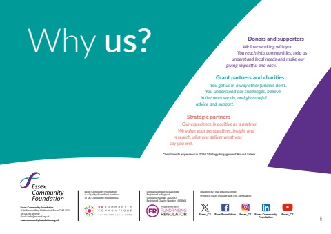 Why us? Donors and supportersWe love working with you. You reach into communities, help us understand local needs and make our giving impactful and easy.Grant partners and charitiesYou get us in a way other funders don%u2019t. You understand our challenges, believe in the work we do, and give useful advice and support.Strategic partnersOur experience is positive as a partner. We value your perspectives, insight and research, plus you deliver what you say you will.*Sentiments expressed in 2024 Strategy Engagement Round TablesEssex Community Foundation is a Quality Accredited member of UK Community Foundations.2026Designed by: Trait Design LimitedPrinted in Essex on paper with FSC certificationEssex Community Foundation3 Hoffmanns Way, Chelmsford, Essex CM1 1GUTel: 01245 355947 Email: hello@essexcf.org.ukessexcommunityfoundation.org.ukCompany limited by guarantee Registered in EnglandCompany Number 3062567 Registered Charity Number 1052061Essex_CF EssexFoundation Essex Community FoundationEssex_CF Essex_CF